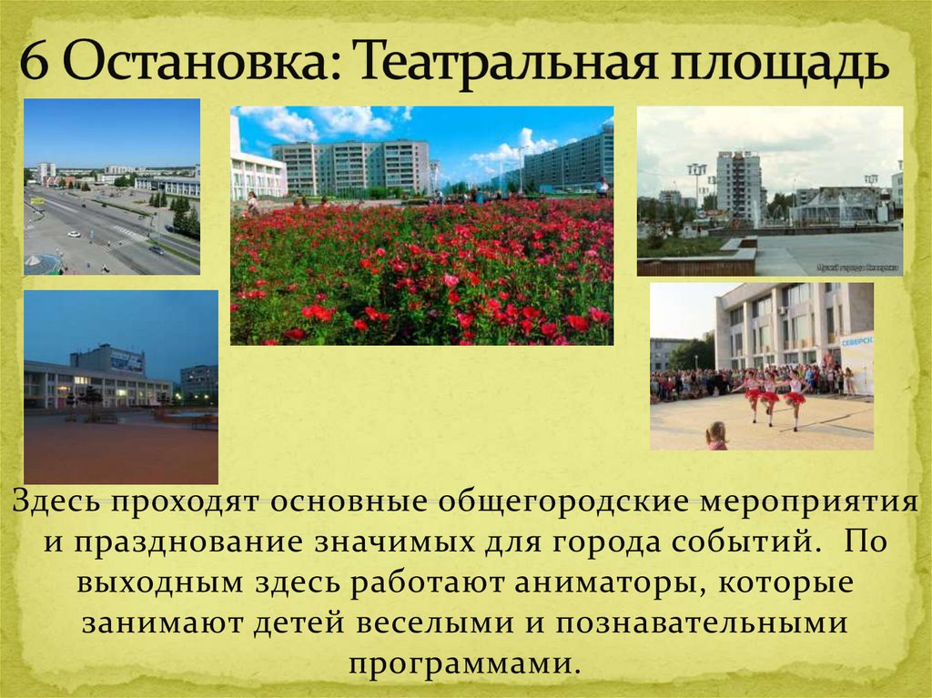 Здесь проходят основные общегородские мероприятияи празднование значимых для города событий. По