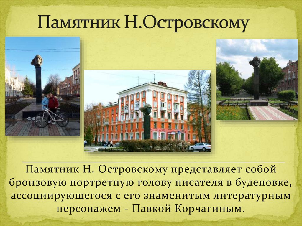 Памятник Н. Островскому представляет собойбронзовую портретную голову писателя в буденовке,