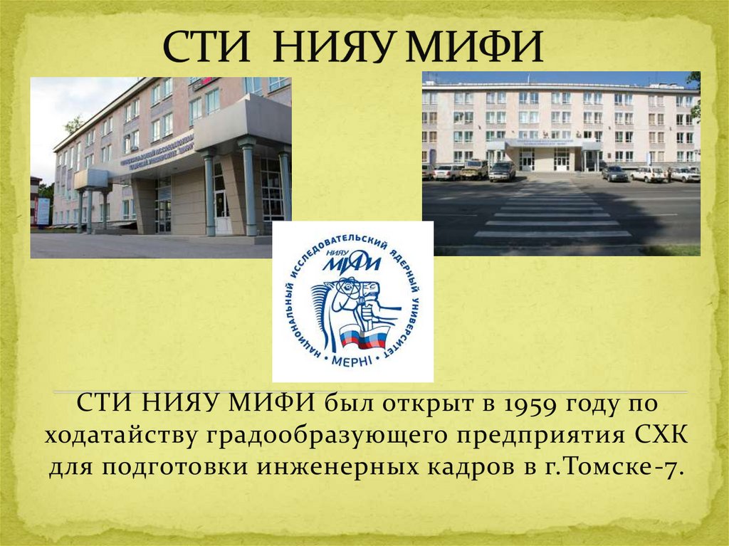 СТИ НИЯУ МИФИ был открыт в 1959 году походатайству градообразующего предприятия СХК