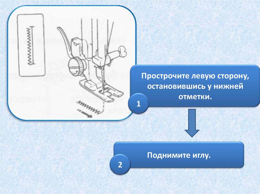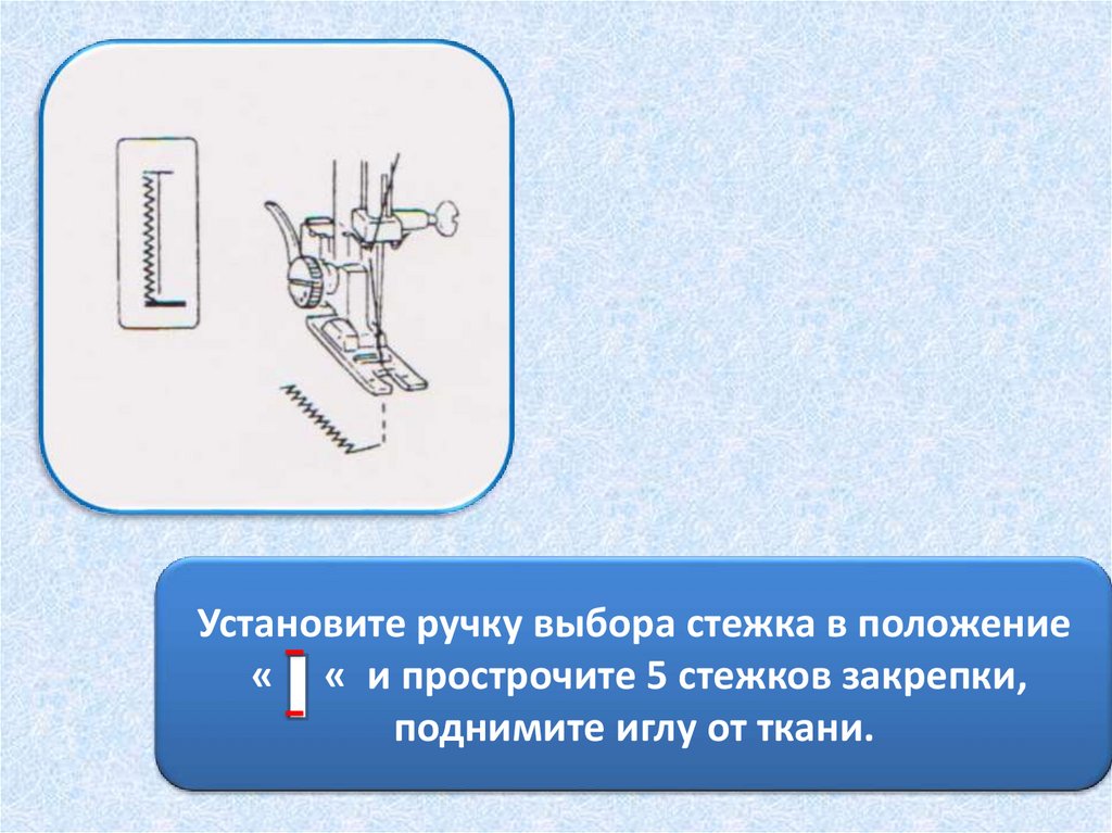 Установите ручку выбора стежка в положение« « и прострочите 5 стежков закрепки,