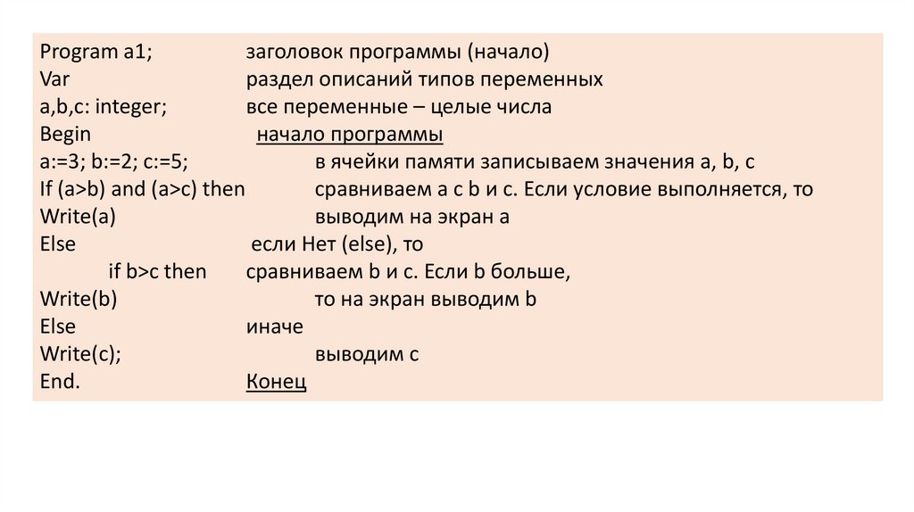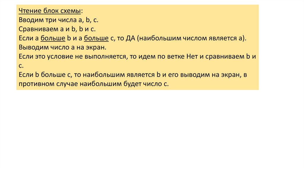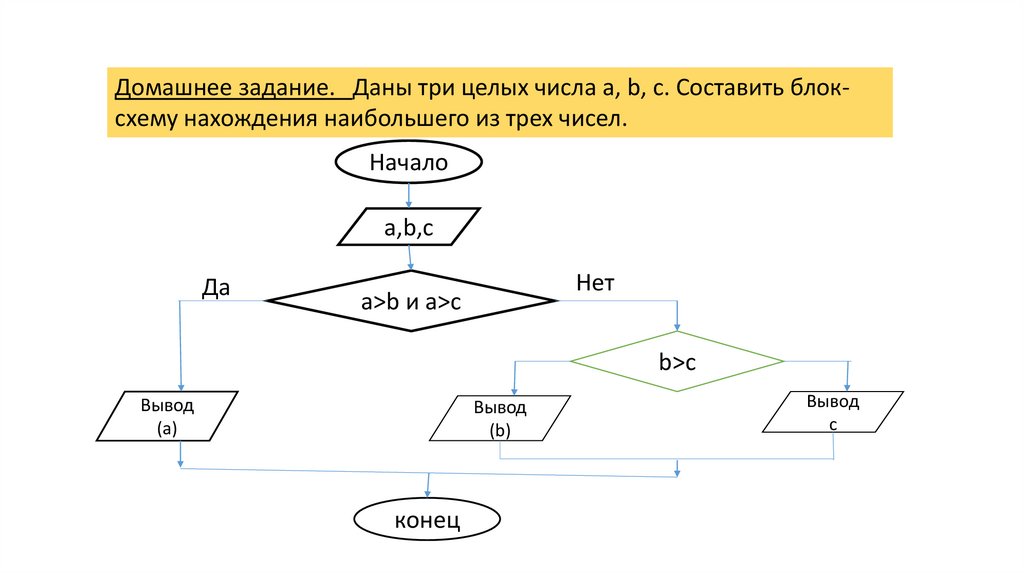 Домашнее задание. Даны три целых числа a, b, c. Составить блоксхему нахождения наибольшего из трех чисел.Начало