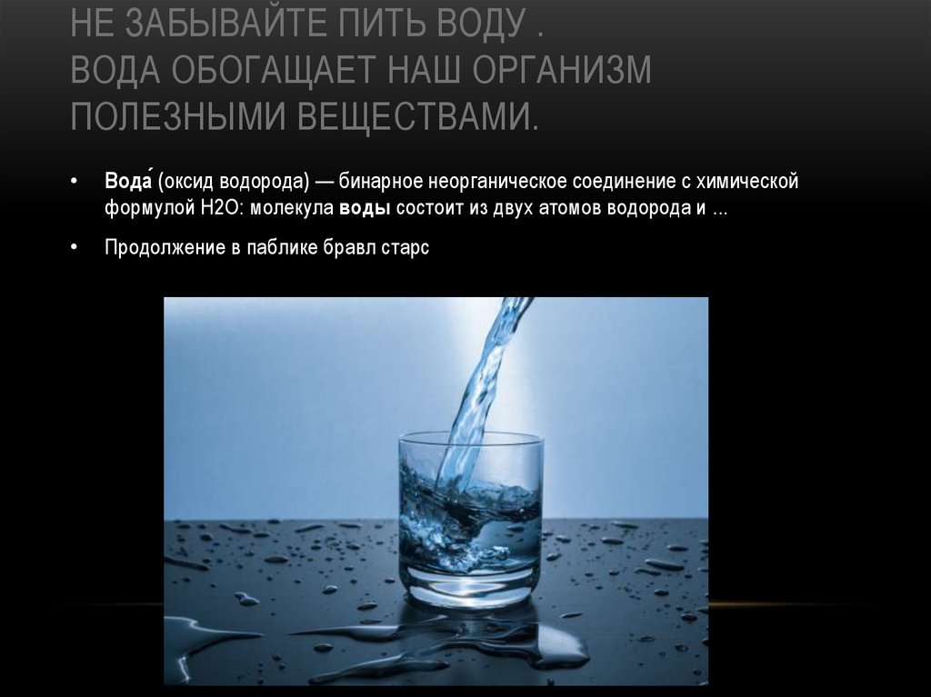НЕ ЗАБЫВАЙТЕ ПИТЬ ВОДУ .ВОДА ОБОГАЩАЕТ НАШ ОРГАНИЗМ