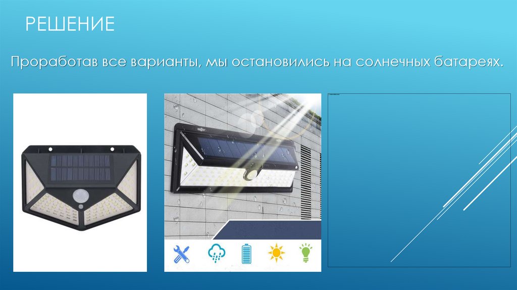 РЕШЕНИЕПроработав все варианты, мы остановились на солнечных батареях.