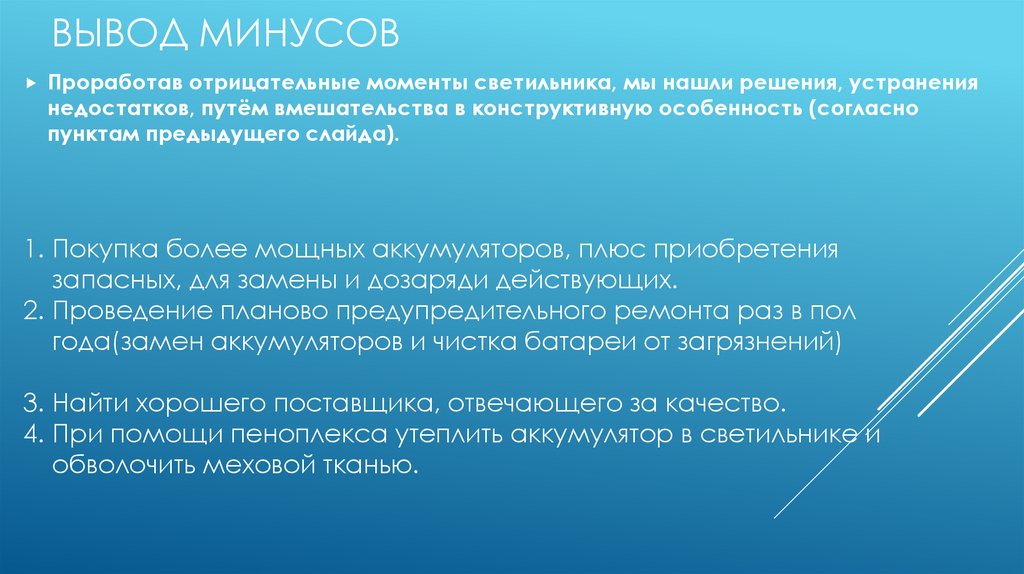 ВЫВОД МИНУСОВПроработав отрицательные моменты светильника, мы нашли решения, устранения