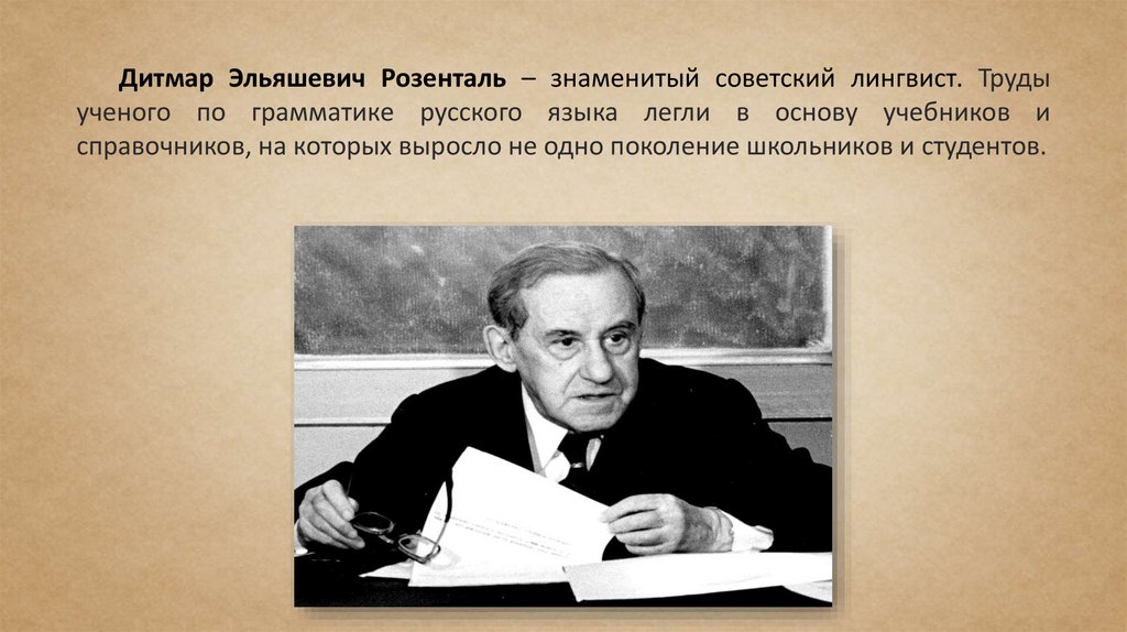Дитмар Эльяшевич Розенталь – знаменитый советский лингвист. Трудыученого по грамматике русского языка легли в основу учебников и