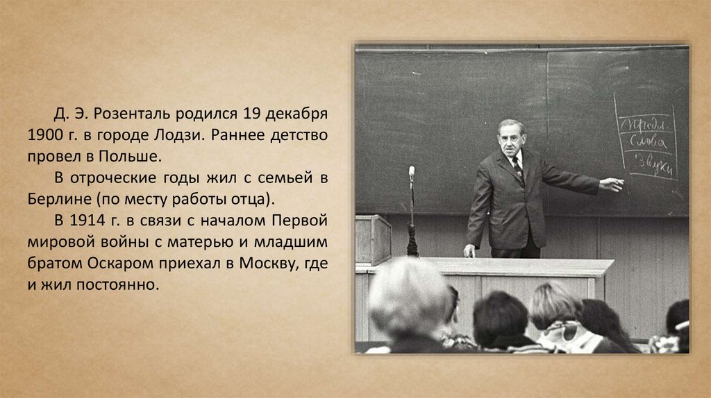 Д. Э. Розенталь родился 19 декабря1900 г. в городе Лодзи. Раннее детство