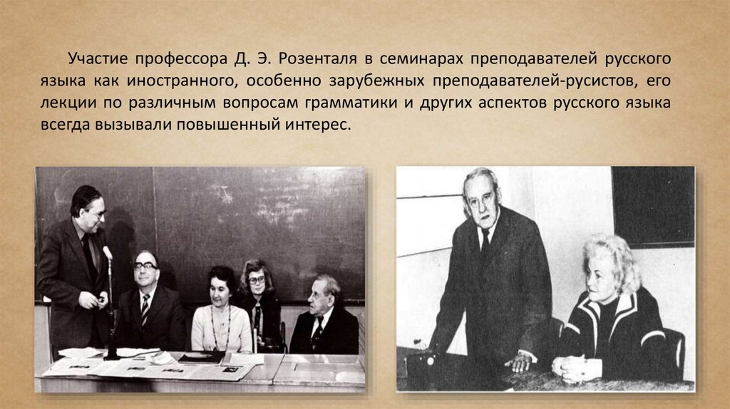 Участие профессора Д. Э. Розенталя в семинарах преподавателей русскогоязыка как иностранного, особенно зарубежных преподавателей-русистов, его