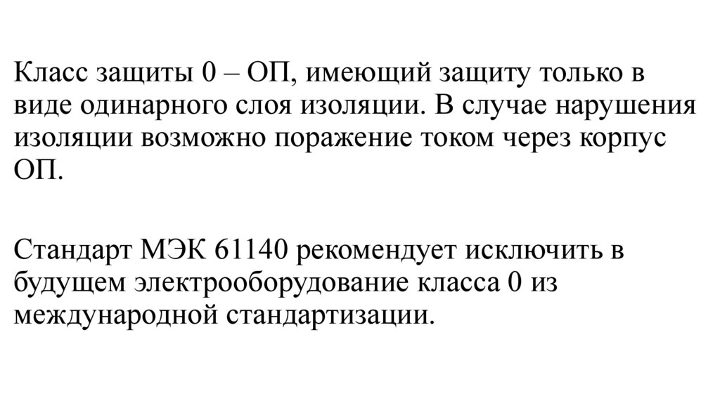 Класс защиты 0 – ОП, имеющий защиту только ввиде одинарного слоя изоляции. В случае нарушения