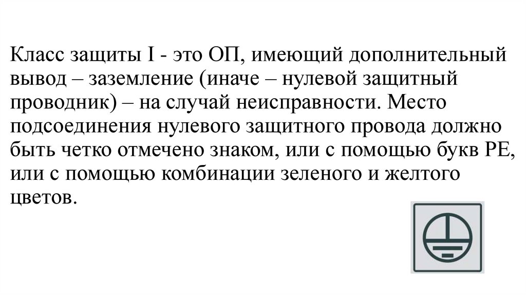 Класс защиты I - это ОП, имеющий дополнительныйвывод – заземление (иначе – нулевой защитный