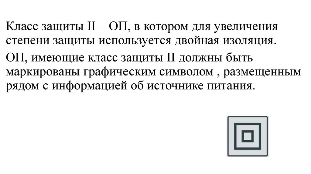 Класс защиты II – ОП, в котором для увеличениястепени защиты используется двойная изоляция.