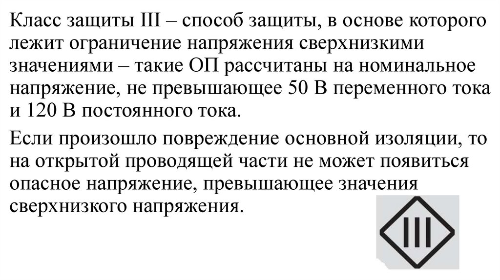 Класс защиты III – способ защиты, в основе котороголежит ограничение напряжения сверхнизкими