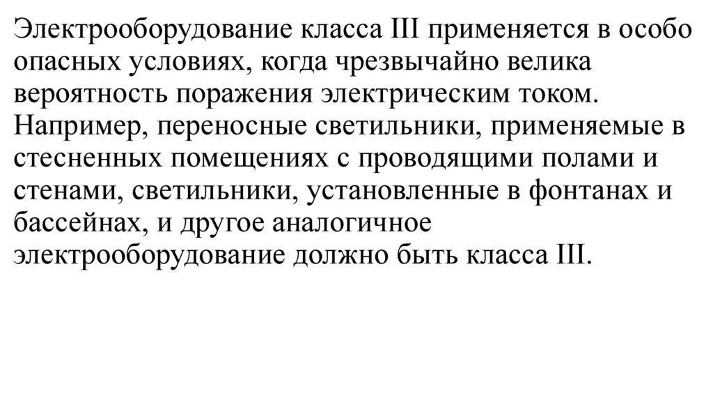 Электрооборудование класса III применяется в особоопасных условиях, когда чрезвычайно велика