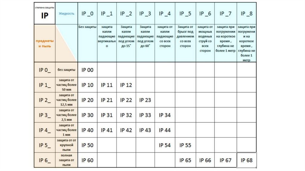 Классификация по степени защиты отпыли и влаги (IP).