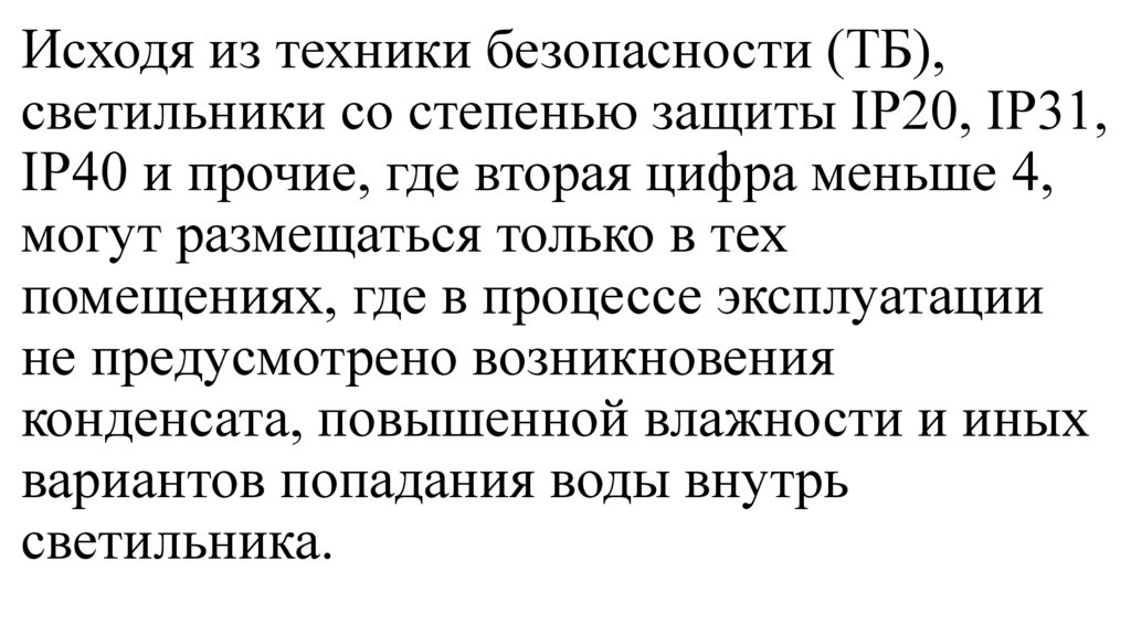 Исходя из техники безопасности (ТБ),светильники со степенью защиты IP20, IP31,