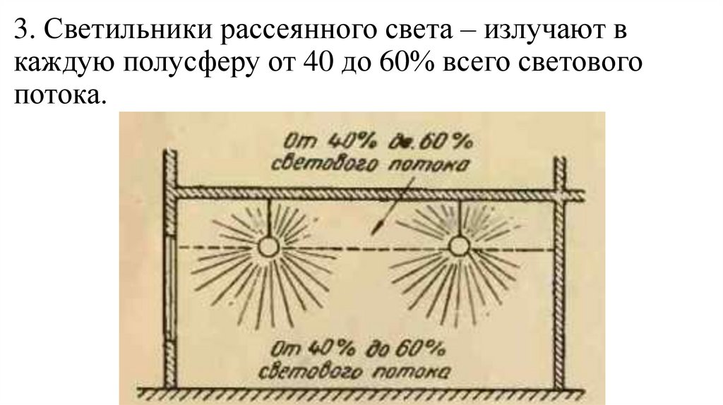 3. Светильники рассеянного света – излучают вкаждую полусферу от 40 до 60% всего светового