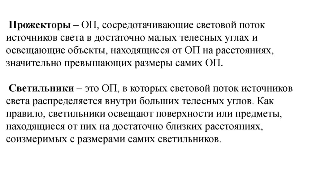 Прожекторы – ОП, сосредотачивающие световой потокисточников света в достаточно малых телесных углах и