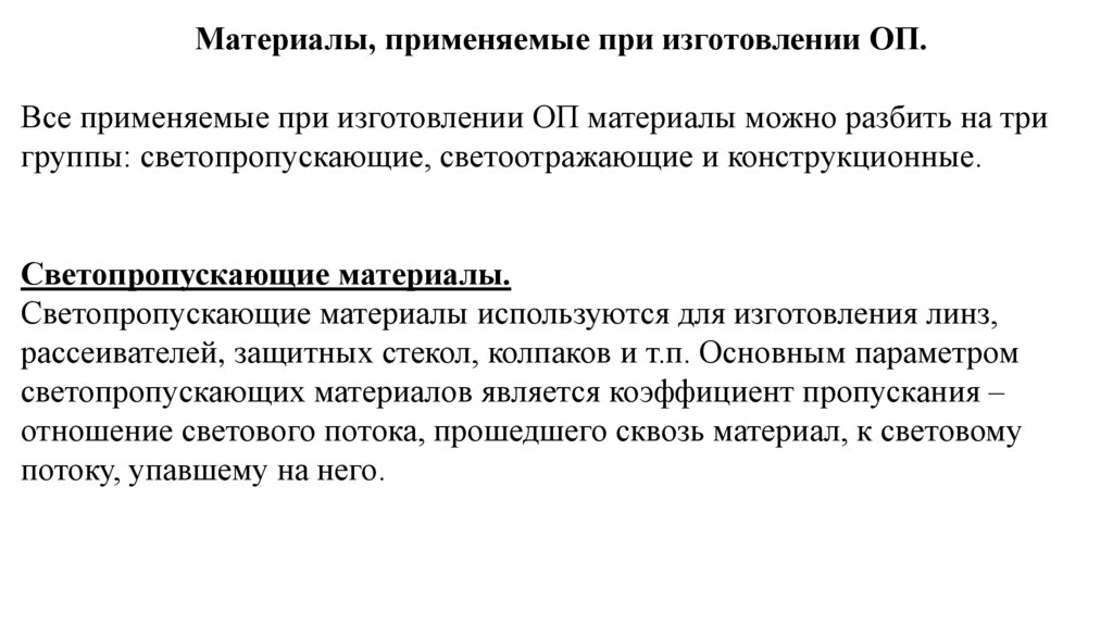 группы: светопропускающие, светоотражающие и конструкционные.