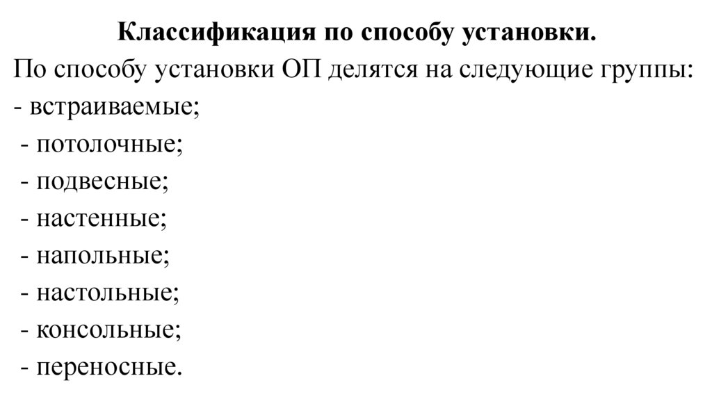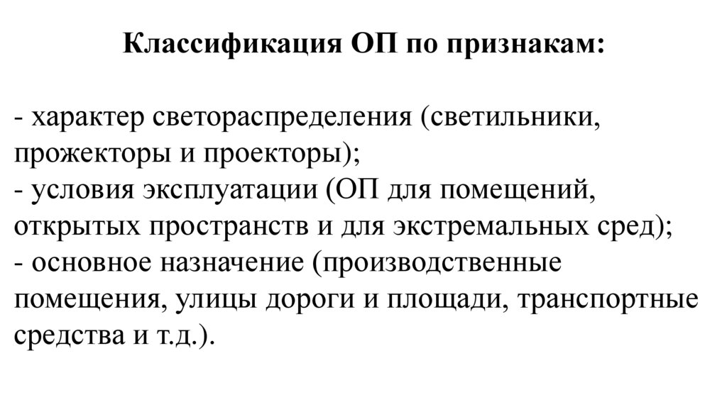 Классификация ОП по признакам:- характер светораспределения (светильники,