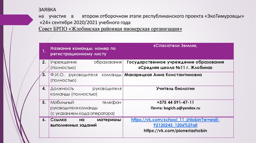 Ф.И.О. руководителя команды Макарецкая Анна Константиновна