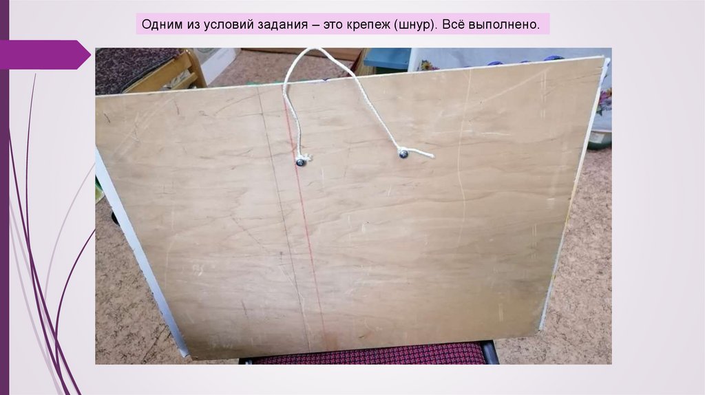 Одним из условий задания – это крепеж (шнур). Всё выполнено.17.