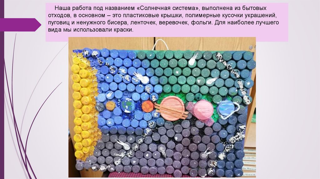 Наша работа под названием «Солнечная система», выполнена из бытовыхотходов, в основном – это пластиковые крышки, полимерные кусочки украшений,