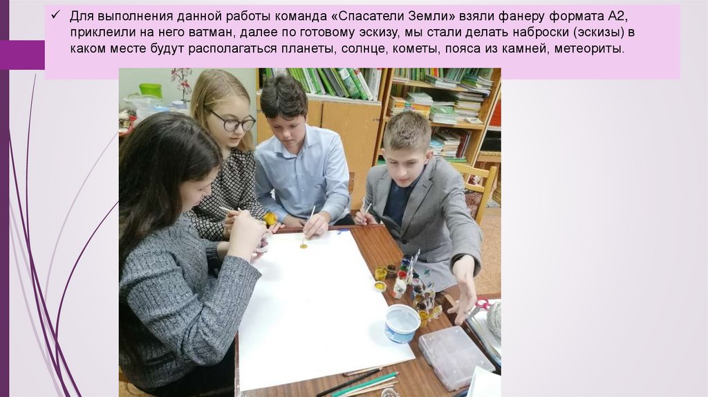 Для выполнения данной работы команда «Спасатели Земли» взяли фанеру формата А2,приклеили на него ватман, далее по готовому эскизу, мы стали делать наброски (эскизы) в