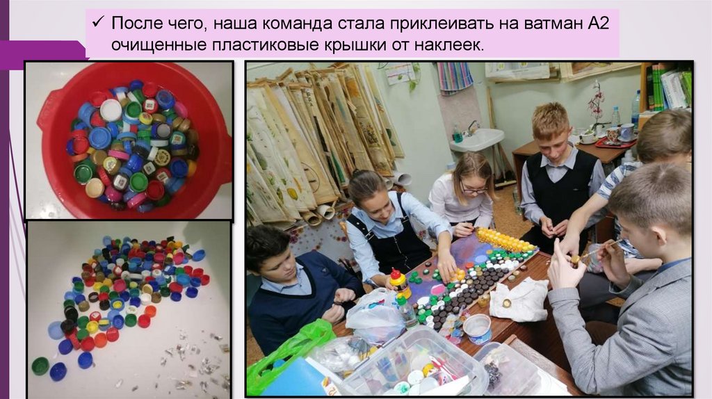 После чего, наша команда стала приклеивать на ватман А2очищенные пластиковые крышки от наклеек.