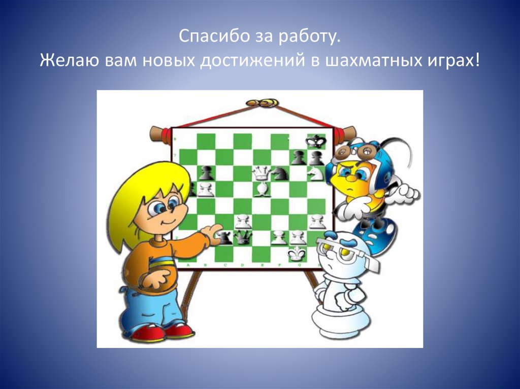 Спасибо за работу.Желаю вам новых достижений в шахматных играх!