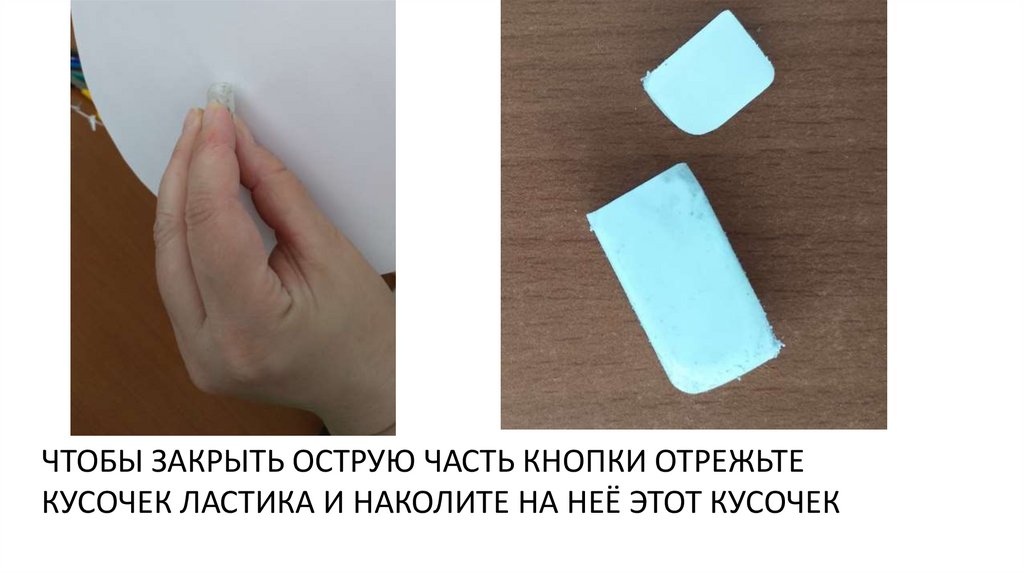 ЧТОБЫ ЗАКРЫТЬ ОСТРУЮ ЧАСТЬ КНОПКИ ОТРЕЖЬТЕКУСОЧЕК ЛАСТИКА И НАКОЛИТЕ НА НЕЁ ЭТОТ КУСОЧЕК