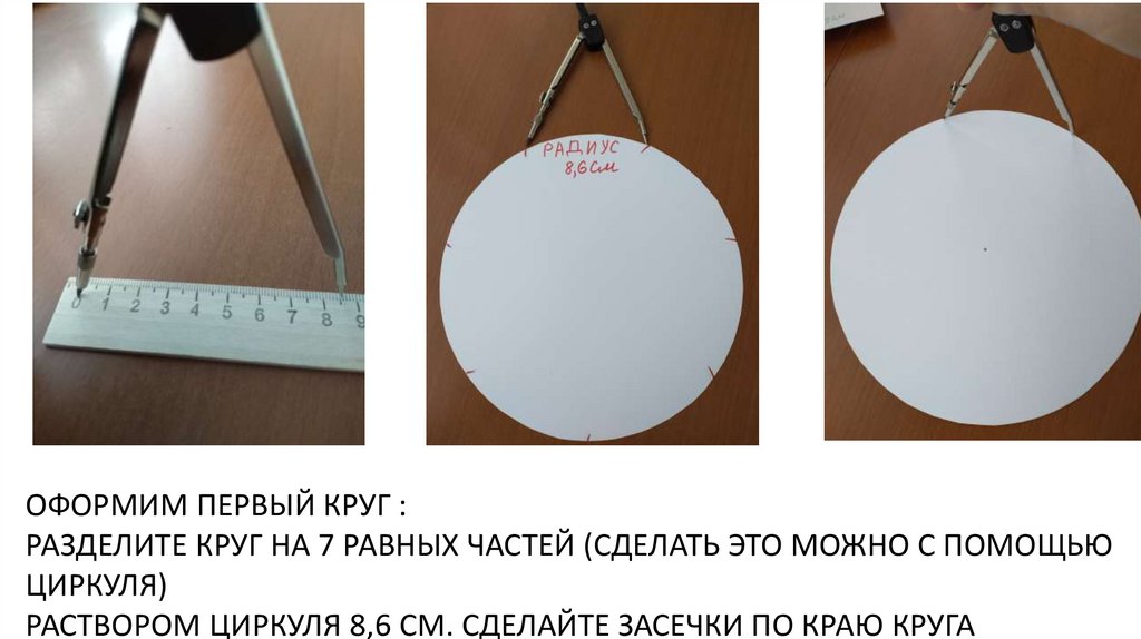 НА ВТОРОМ КРУГЕ СДЕЛАЙТЕ ЦИРКУЛЕМ ЗАСЕЧКИ РАДИУСОМ 8,6 САНТИМЕТРОВ.СОЕДИНИТЕ ЗАСЕЧКИ С ЦЕНТРОМ КРУГА