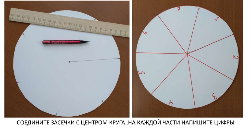 СОЕДИНИТЕ ЗАСЕЧКИ С ЦЕНТРОМ КРУГА ,НА КАЖДОЙ ЧАСТИ НАПИШИТЕ ЦИФРЫ6.