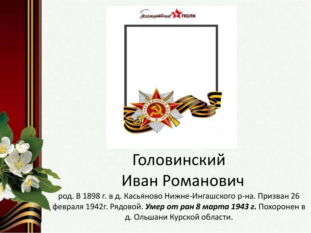 февраля 1942г. Рядовой. Умер от ран 8 марта 1943 г. Похоронен в