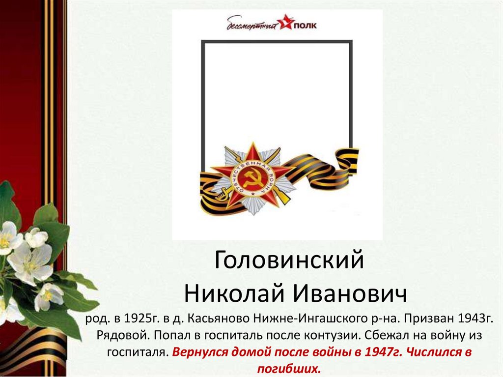 госпиталя. Вернулся домой после войны в 1947г. Числился в