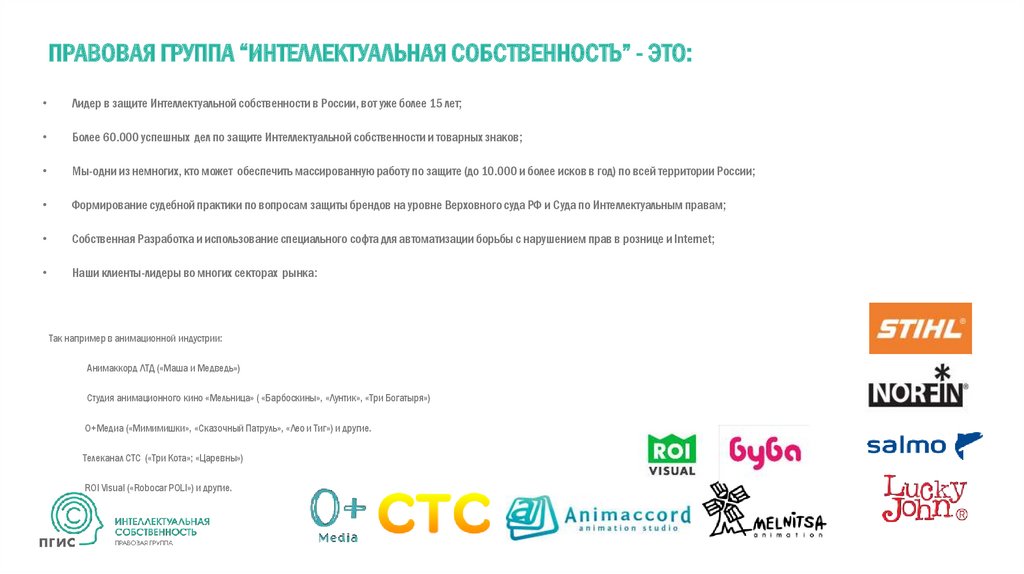 ПРАВОВАЯ ГРУППА “ИНТЕЛЛЕКТУАЛЬНАЯ СОБСТВЕННОСТЬ” - ЭТО:Лидер в защите Интеллектуальной собственности в России, вот уже более 15 лет;