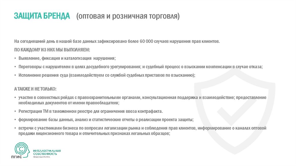 ЗАЩИТА БРЕНДА (оптовая и розничная торговля)На сегодняшний день в нашей базе данных зафиксировано более 60 000 случаев нарушения прав клиентов.