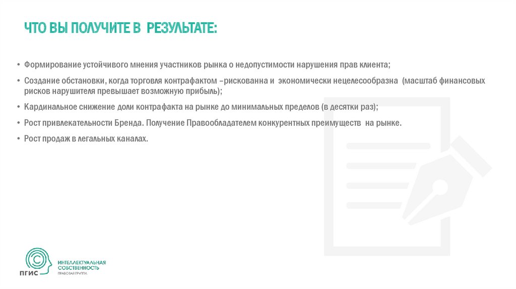 ЧТО ВЫ ПОЛУЧИТЕ В РЕЗУЛЬТАТЕ:• Формирование устойчивого мнения участников рынка о недопустимости нарушения прав клиента;
