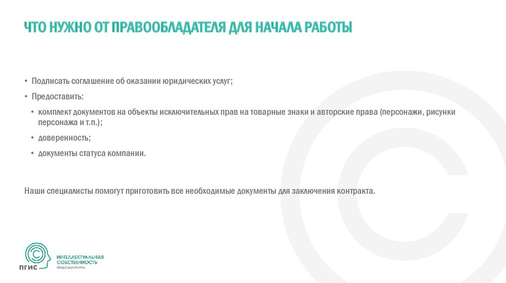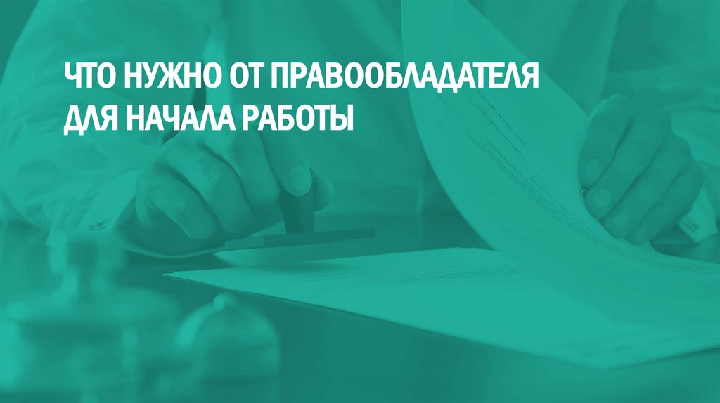 ЧТО НУЖНО ОТ ПРАВООБЛАДАТЕЛЯ ДЛЯ НАЧАЛА РАБОТЫ• Подписать соглашение об оказании юридических услуг;