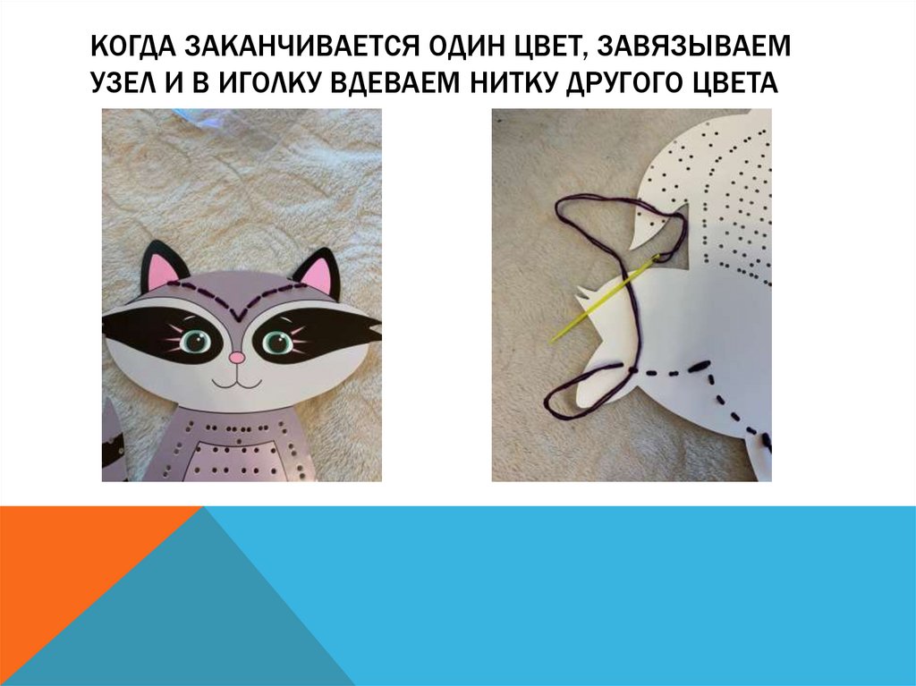 КОГДА ЗАКАНЧИВАЕТСЯ ОДИН ЦВЕТ, ЗАВЯЗЫВАЕМУЗЕЛ И В ИГОЛКУ ВДЕВАЕМ НИТКУ ДРУГОГО ЦВЕТА