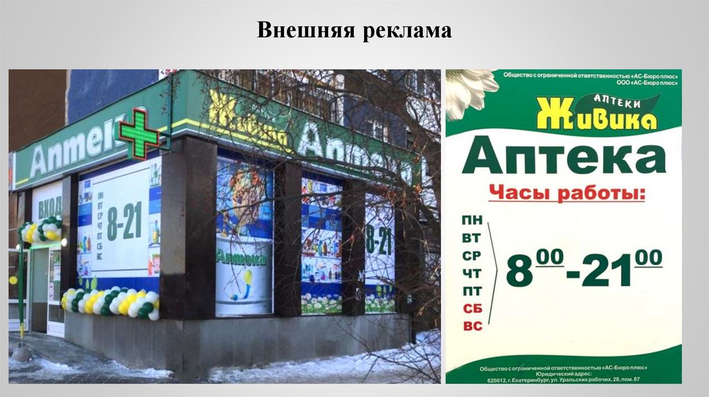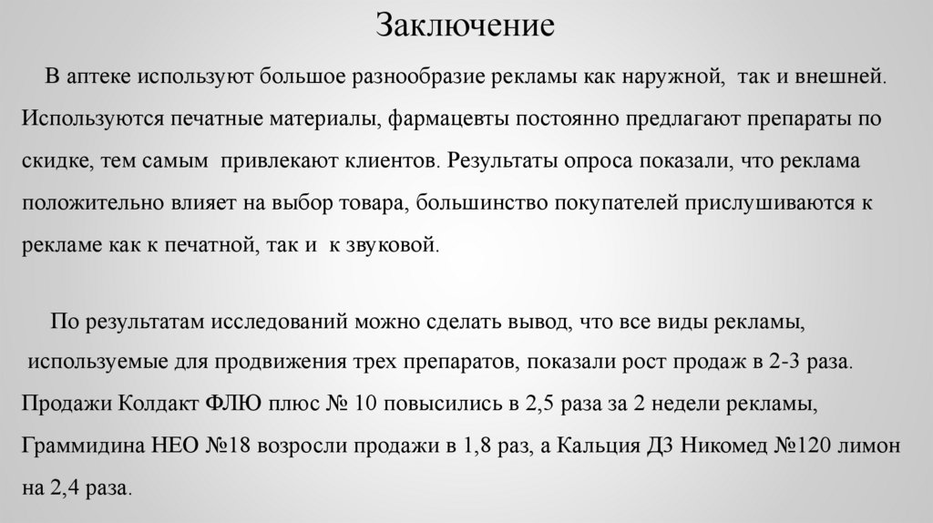 ЗаключениеВ аптеке используют большое разнообразие рекламы как наружной, так и внешней.