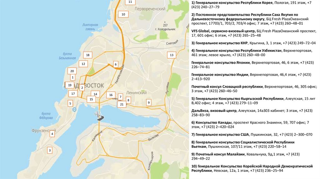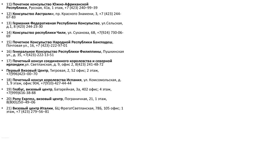 • 11) Почетное консульство Южно-АфриканскойРеспублики, Русская, 41в, 1 этаж, +7 (423) 240‒99‒39