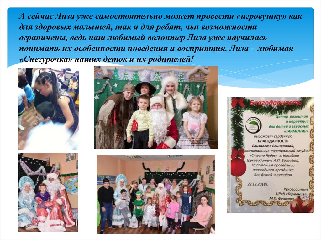 А сейчас Лиза уже самостоятельно может провести «игровушку» какдля здоровых малышей, так и для ребят, чьи возможности