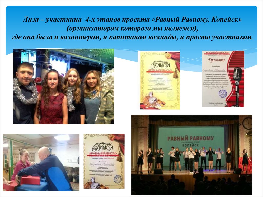 Лиза – участница 4-х этапов проекта «Равный Равному. Копейск»(организатором которого мы являемся),