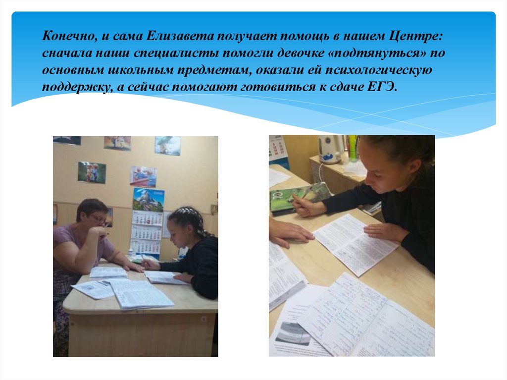 Конечно, и сама Елизавета получает помощь в нашем Центре:сначала наши специалисты помогли девочке «подтянуться» по