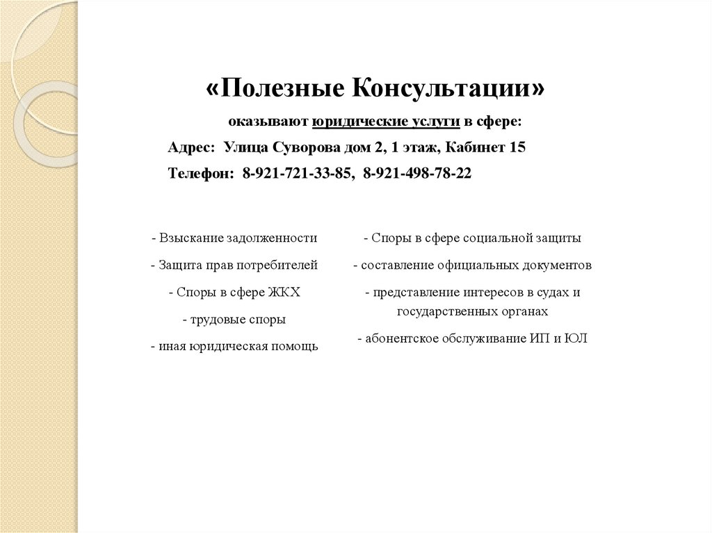 «Полезные Консультации»оказывают юридические услуги в сфере:
