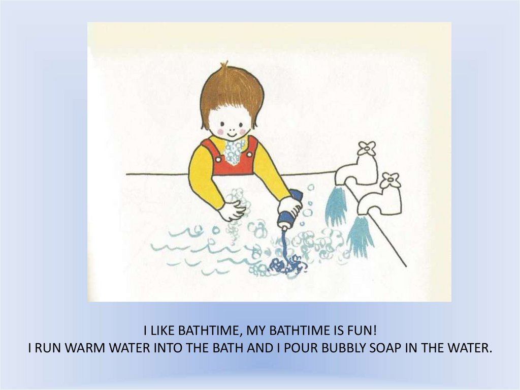 I LIKE BATHTIME, MY BATHTIME IS FUN!I RUN WARM WATER INTO THE BATH AND I POUR BUBBLY SOAP IN THE WATER.