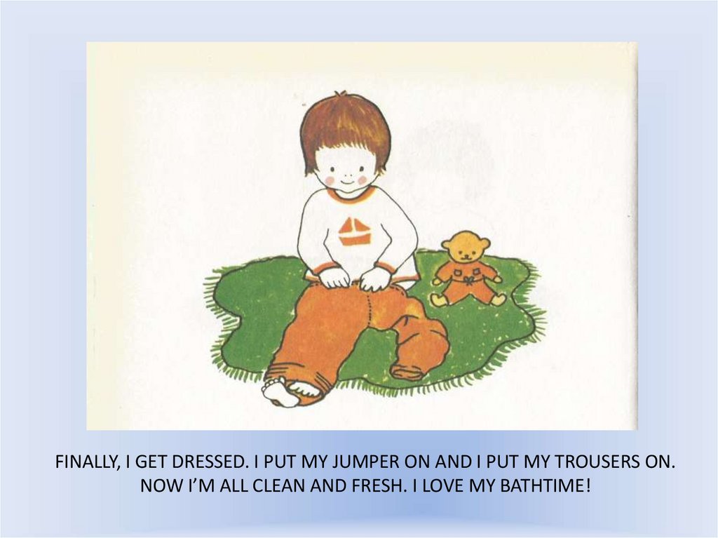 FINALLY, I GET DRESSED. I PUT MY JUMPER ON AND I PUT MY TROUSERS ON.NOW I’M ALL CLEAN AND FRESH. I LOVE MY BATHTIME!