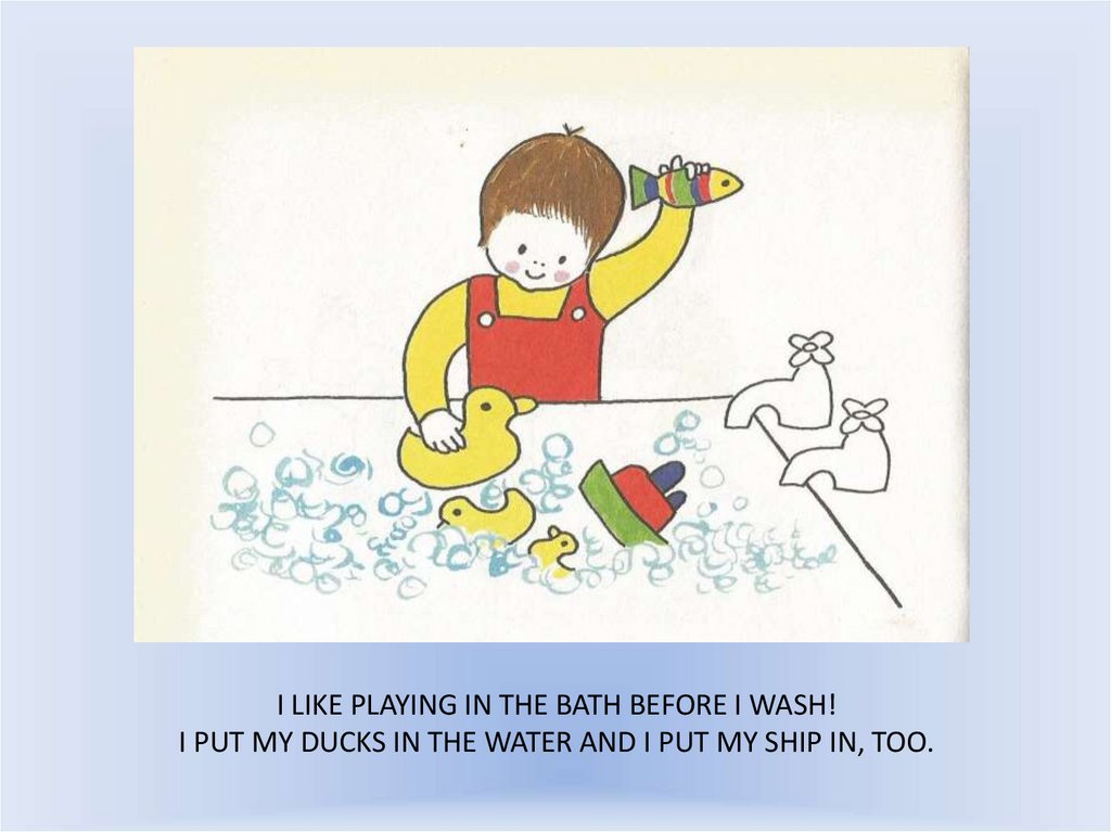 I LIKE PLAYING IN THE BATH BEFORE I WASH!I PUT MY DUCKS IN THE WATER AND I PUT MY SHIP IN, TOO.