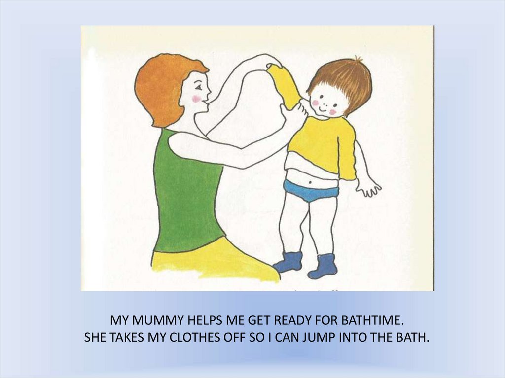 MY MUMMY HELPS ME GET READY FOR BATHTIME.SHE TAKES MY CLOTHES OFF SO I CAN JUMP INTO THE BATH.