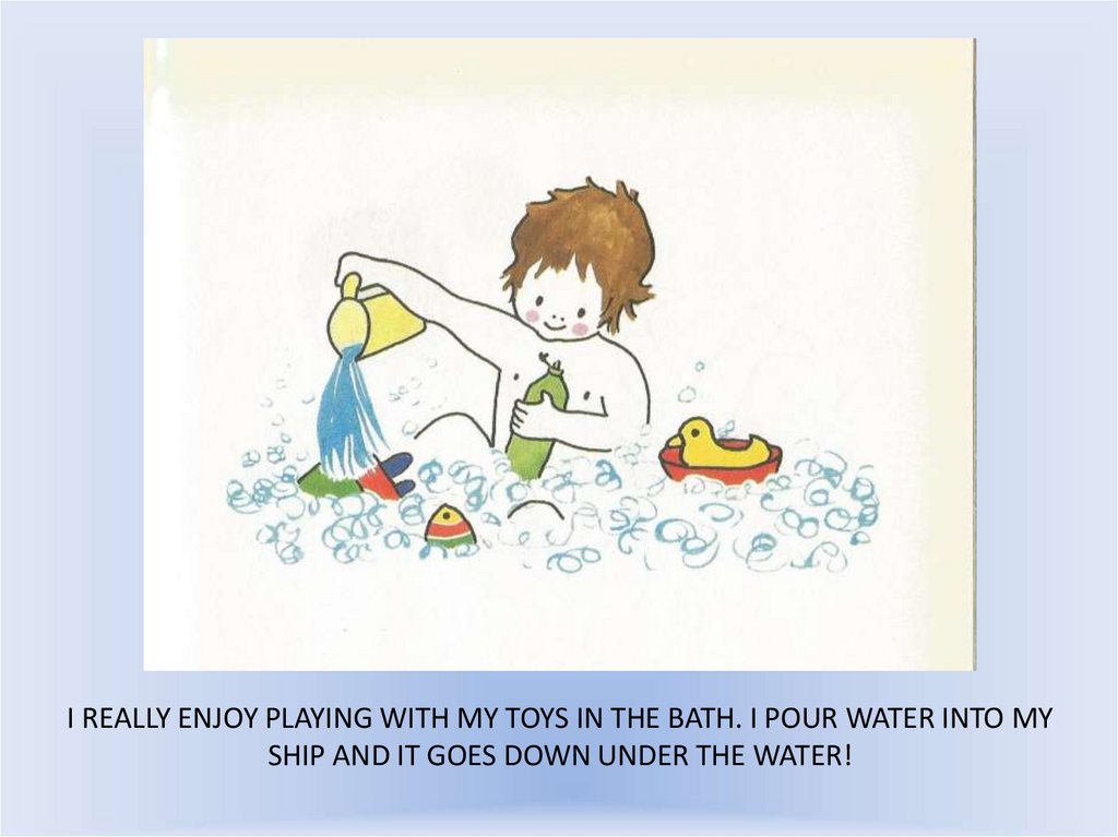 I REALLY ENJOY PLAYING WITH MY TOYS IN THE BATH. I POUR WATER INTO MYSHIP AND IT GOES DOWN UNDER THE WATER!