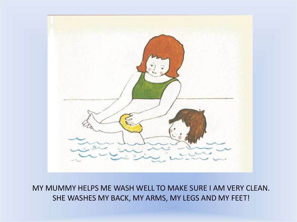 MY MUMMY HELPS ME WASH WELL TO MAKE SURE I AM VERY CLEAN.SHE WASHES MY BACK, MY ARMS, MY LEGS AND MY FEET!
